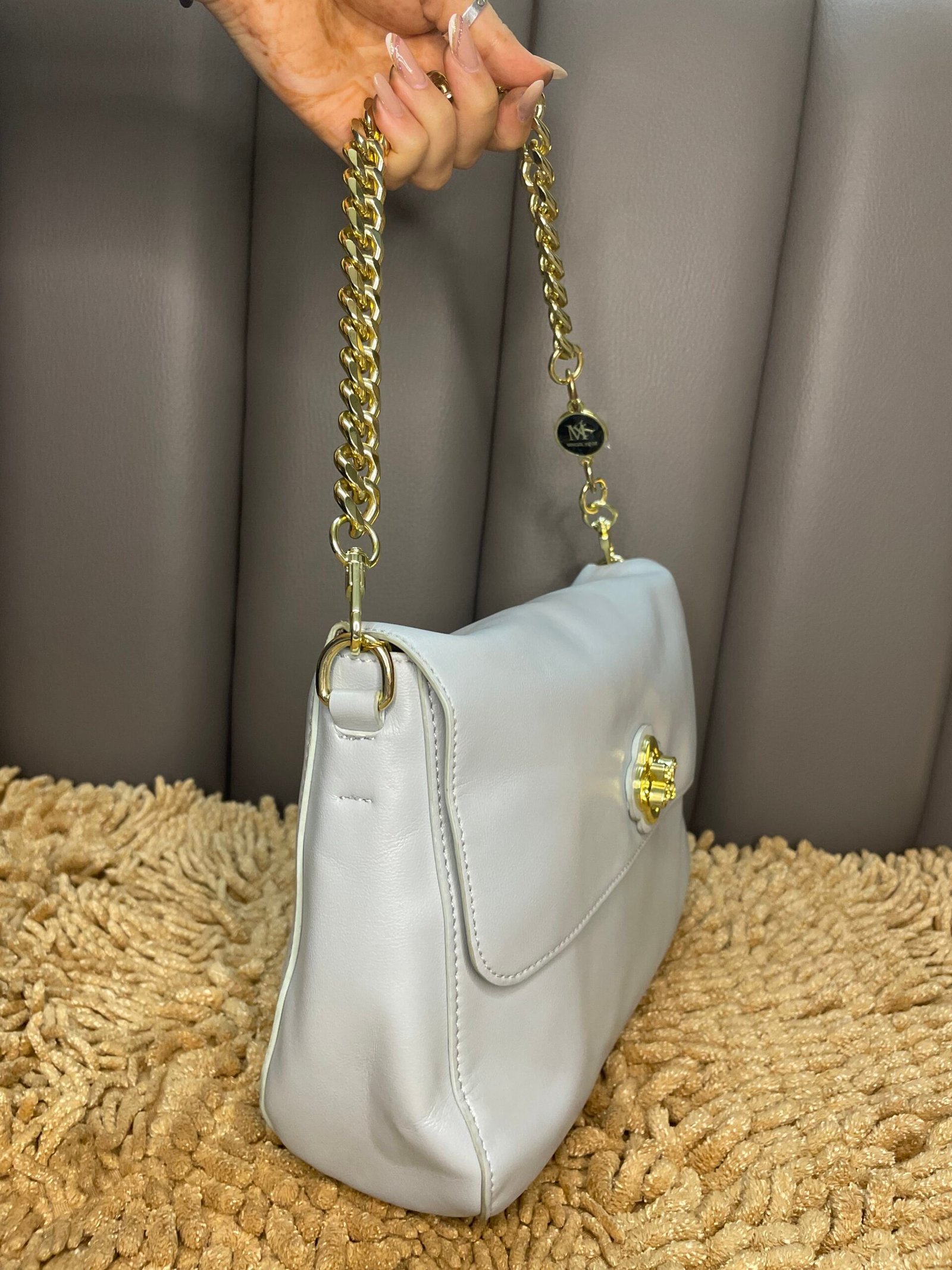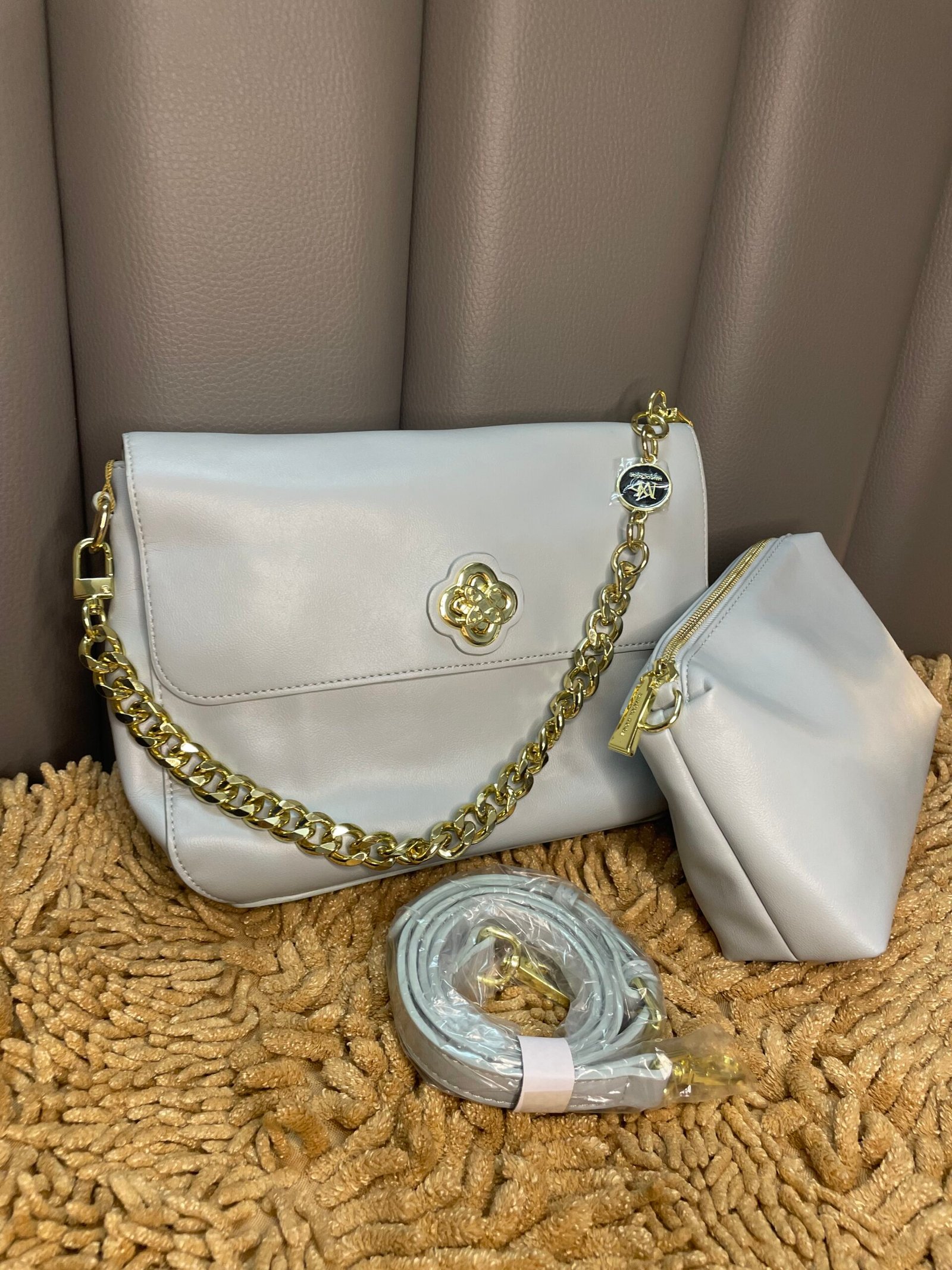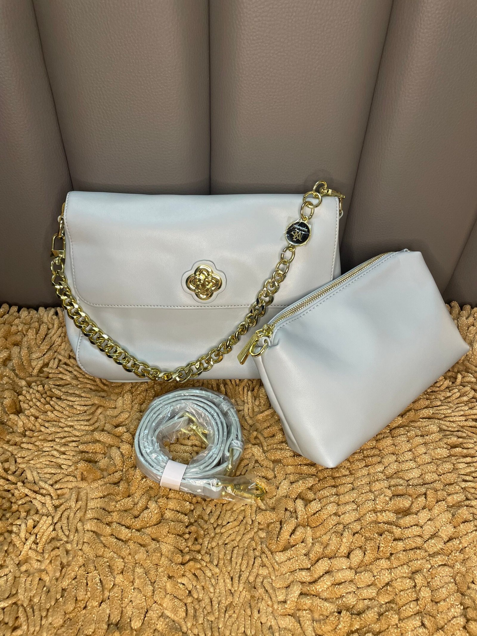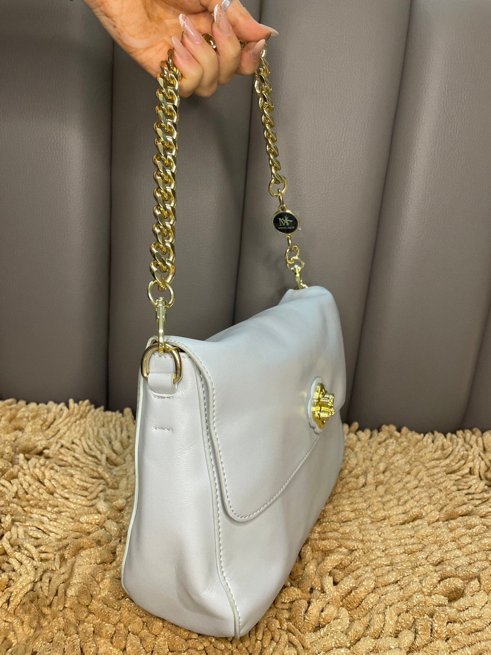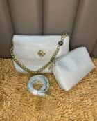 - Material: Meticulously crafted from high-quality, durable materials, the Silver Radiance bag boasts a sleek, smooth texture that feels luxurious to the touch.